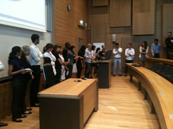從英國來的Kay要我們128人按照年齡(出生年月日)排成一排,前提是不能發出聲音。大家開始拿紙筆的拿紙筆,我則是一把抓住iPhone,打下自己的出生年月日。你就看到128個MBA學生比手畫腳地開始排隊,過了二十分鐘隊伍才亂哄哄(雖然不能發出聲音,但你可以感受到群眾的緊張)的排好。結果發現,班上最老的是1973年出生,最年輕的是1987年生(而且他已婚)。我1982年生站在圈圈中間,算是平均值,由此可見歐洲MBA平均年齡的確較美國學校來的高。